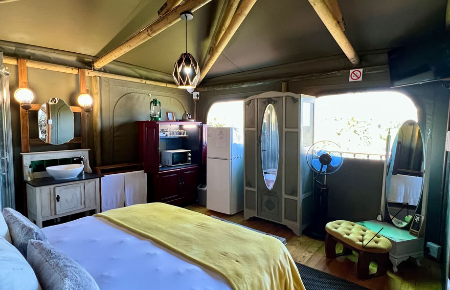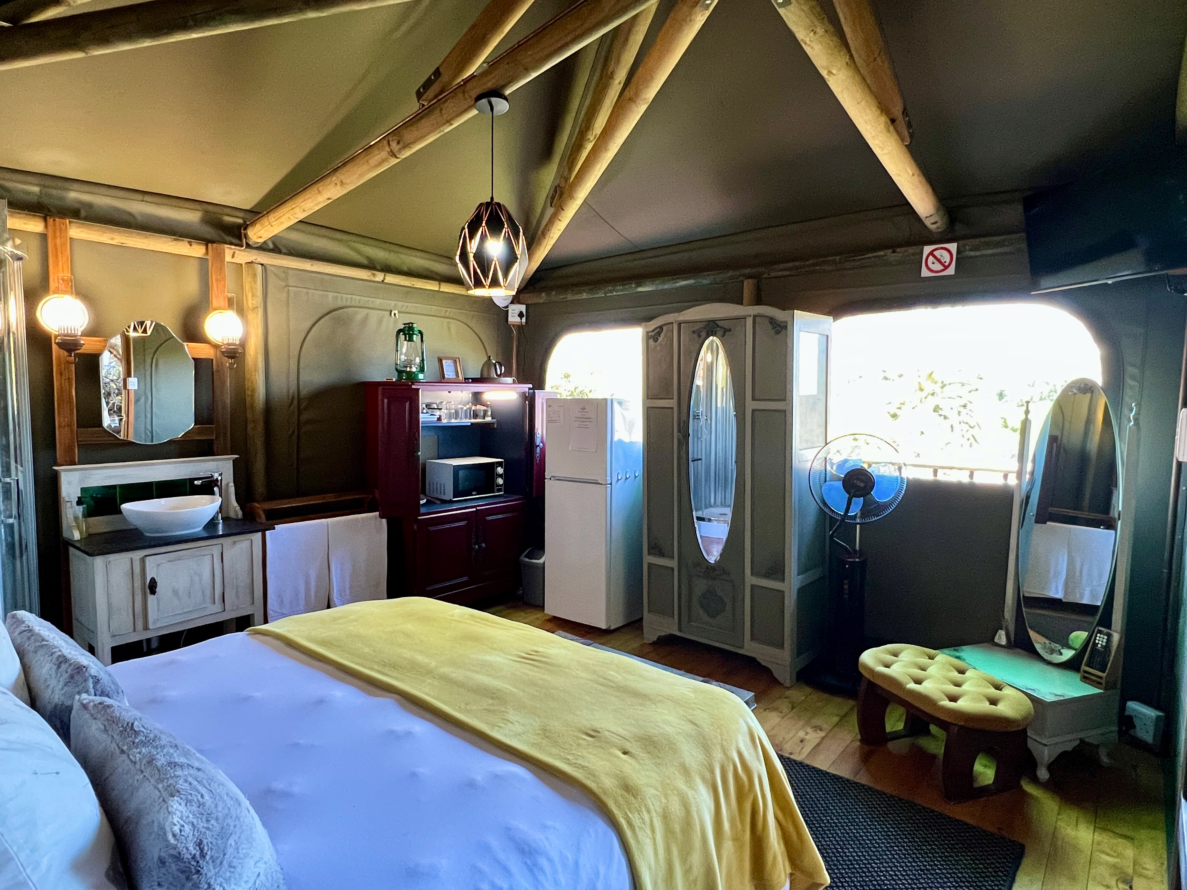 A 30 square meter elegantly decorated luxury tent sleeping two people with Queen bed, luxury linen and en-suite shower, basin and private toilet.